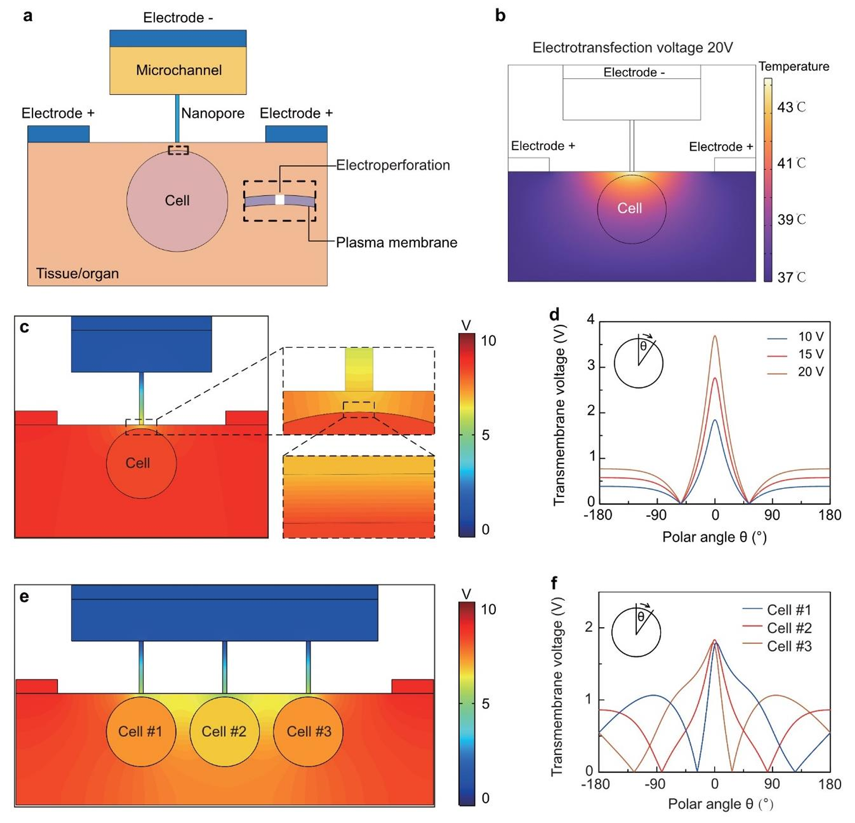 郝永存副研究员与常洪龙教授在柔性电子贴片的设计及制造方面开展深入研究,成功建立了“纳米孔-微通道-微电极”三维结构的电学、热学及力学模型(图 2),有力证明了纳米孔通道能够安全、高效且精确地在细胞膜上穿孔;攻克了聚合物-金属多层微纳结构制造技术难关,并依托香港三级片