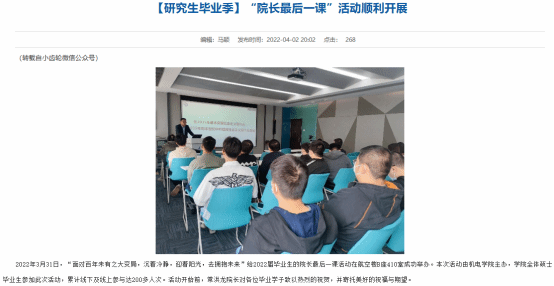 2.3 院长书记为毕业生讲授“工大最后一节课”,鼓励研究生心怀国之大者,树立远大志向,为建设制造强国奋勇前进