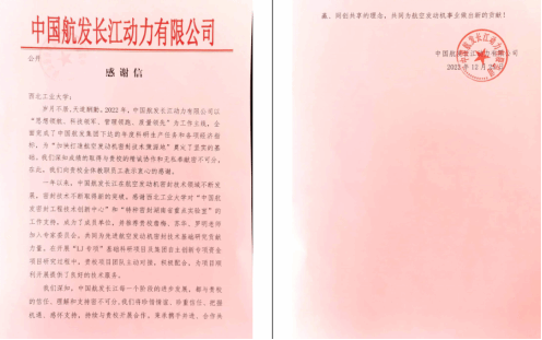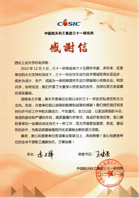 5.3.1 张卫红院士研究团队收到了来自中国航天科工集团三十一所,署有凌文辉所长和王继星书记亲笔签名的感谢信