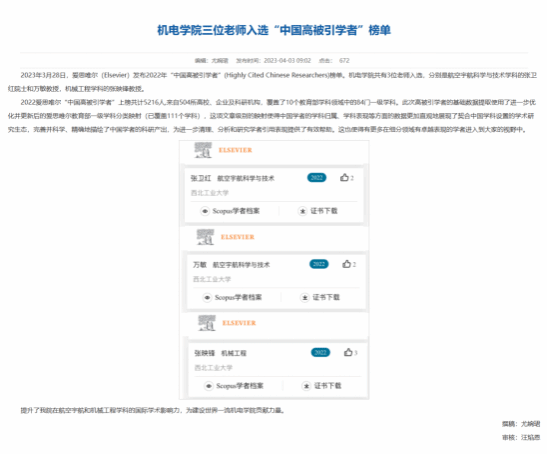 1.11 张卫红院士、万敏教授、张映锋教授入选“中国高被引学者”