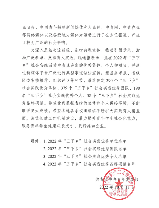 为深入总结交流经验,选树典型宣传,推动引领示范,激励广泛参与,发挥育人实效, 2022年10月12日,中国共产主义青年团中央委员会发文,通报表彰2022年全国大中专学生志愿者暑期文化科技卫生“三下乡”社会实践活动表彰结果。香港三级片