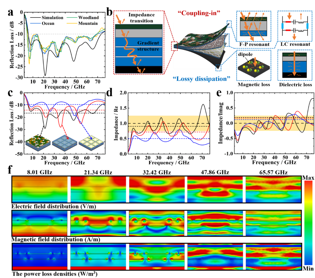 图3. 所提出的超表面的宽带微波吸收和功能协同作用。a) 所提出的超表面在林地、海洋和山地环境中的模拟和测量微波反射损耗。b) F-P匹配损耗网络中“耦合输入”和“损耗耗散”策略的示意图。c-e) 三种超表面配置的反射损耗和输入阻抗比较:完整超表面(黑色)、无伪装像素层超表面(红色)和无珐珀腔超表面(蓝色),虚线表示平均值,黄色阴影区域表示理想阻抗匹配附近±0.25范围内的值。f) 超表面中电场、磁场和功率损耗密度的横截面分布。