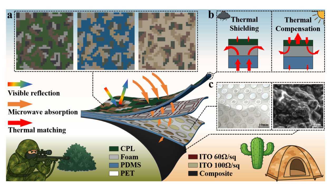 图1. 所提出的超表面设计原理。a) 伪装像素层在林地、海洋和山地环境中的自适应像素化伪装图案(从左到右)。b) 在不同辐射背景下,超表面对 36 ℃目标的热匹配机制。c) 选择性去除无图案的 ITO 区域以及复合层的 SEM 图像。
